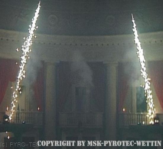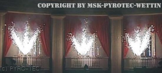Ein phantastischer Farbenzauber aus Funken und Flammen. Extra für den Bühnen- und Studiobereich (innen und außen) entwickelte und gesetzlich zugelassene, raucharme Effekte, wie z.B. Blitze, Sonnen, Wasserfälle, Feuerschriften, Feuertöpfe, Fontänen (in allen Variationen), Flammensäulen, Flammenschalen und viele andere neue Effekte.