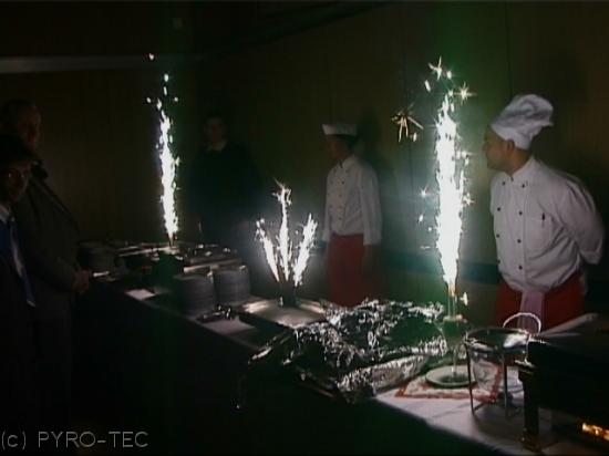 Per Fernzündung wird zur Buffeteröffnung ein Feuerwerk in Form von gefächerten und senkrechten Silberfontänen, farbigen Flammen und roten Bengalfeuer gezündet. Eine preisgünstige Zündanlage zum kaufen oder zum mieten steht zur Verfügung.