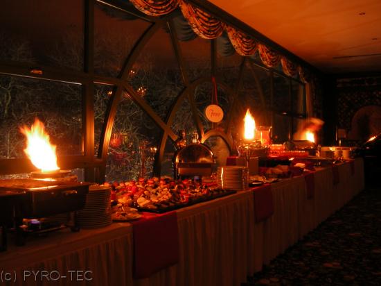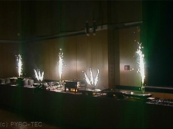 Per Fernzündung wird zur Buffeteröffnung ein Feuerwerk in Form von gefächerten und senkrechten Silberfontänen, farbigen Flammen und roten Bengalfeuer gezündet. Eine preisgünstige Zündanlage zum kaufen oder zum mieten steht zur Verfügung.